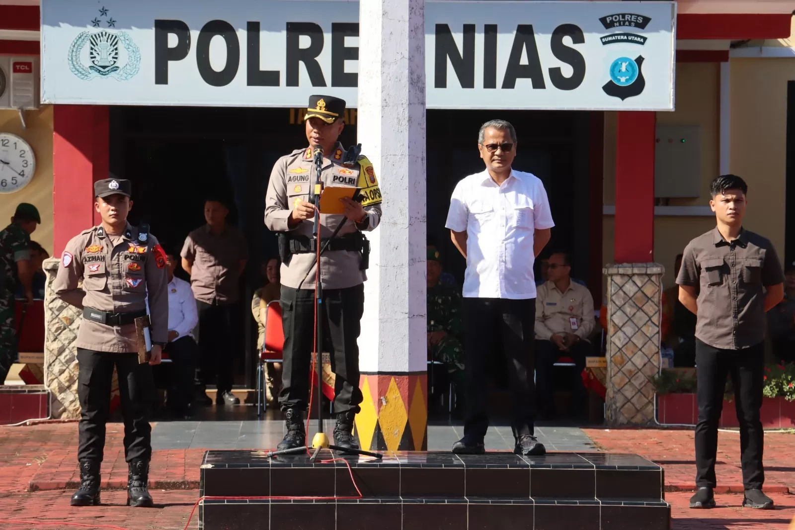 Kapolres Nias AKBP Agung S.D.C., S.Psi., M.Psi., Psi., M.K.P. yang didampingi oleh Bupati Nias Ya’atulo Gulo, S.E., S.H., M.Si. Kegiatan ini dihadiri oleh unsur TNI, pemerintah daerah, serta instansi terkait sebagai bentuk sinergitas lintas sektoral dalam menjaga keamanan dan ketertiban masyarakat selama momentum Nataru.