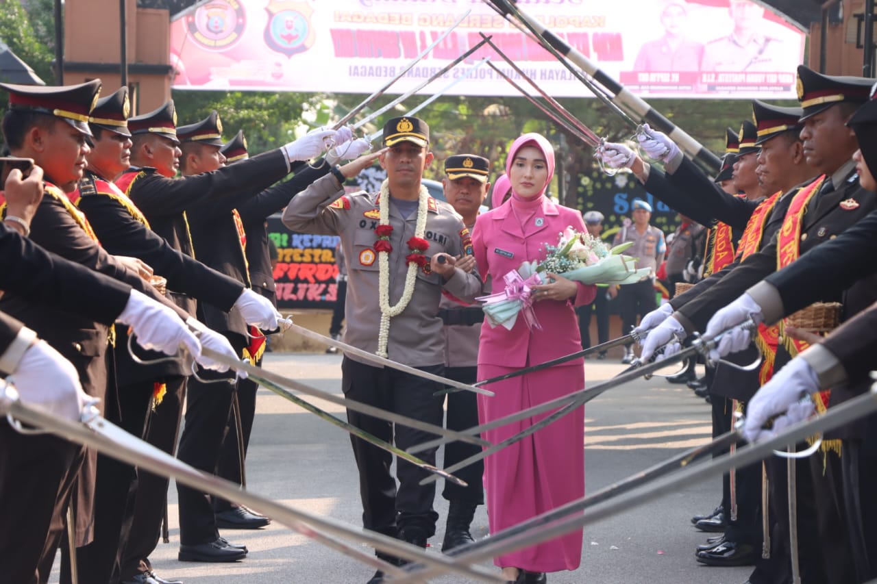 Kapolres Serdang Bedagai yang baru AKBP Oxy dan ibu melalui pasukan pedang pora melintasinya yang di lakukan oleh pasukan Sat Samapta