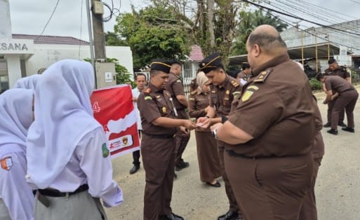 Kemudian seluruh pegawai membagikan stiker dan gantungan kunci yang berisikan himbauan untuk menjauhi korupsi kepada masyarakat Palas di depan Kantor Kejari Palas.