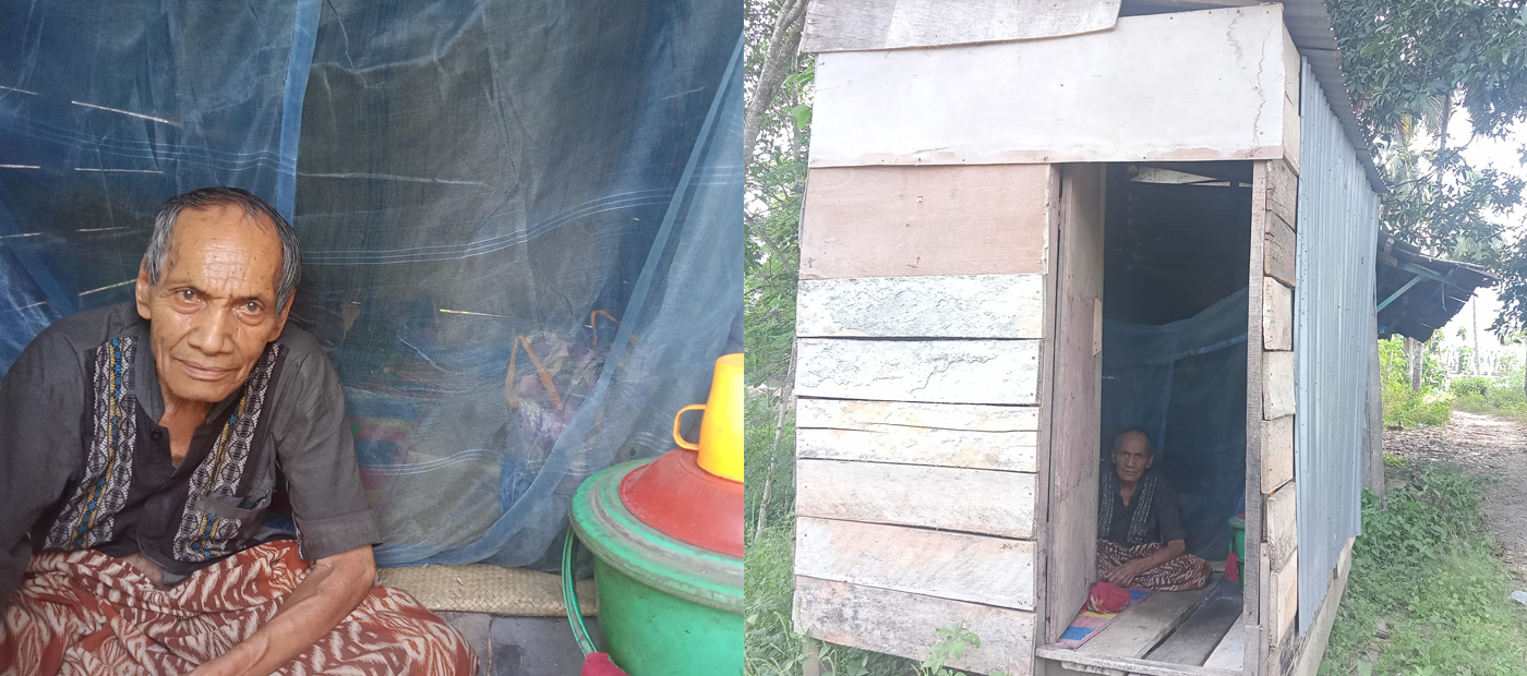 Kakek hanya tinggal seorang diri di gubuk kecil amat memprihatinkan, di dekat jembatan Desa Jambur Padangmatinggi, Kec. Panyabungan Utara, Kab. Mandailing Natal. Untuk bisa makan sekali dalam sehari saja, dia sudah sangat bersyukur.