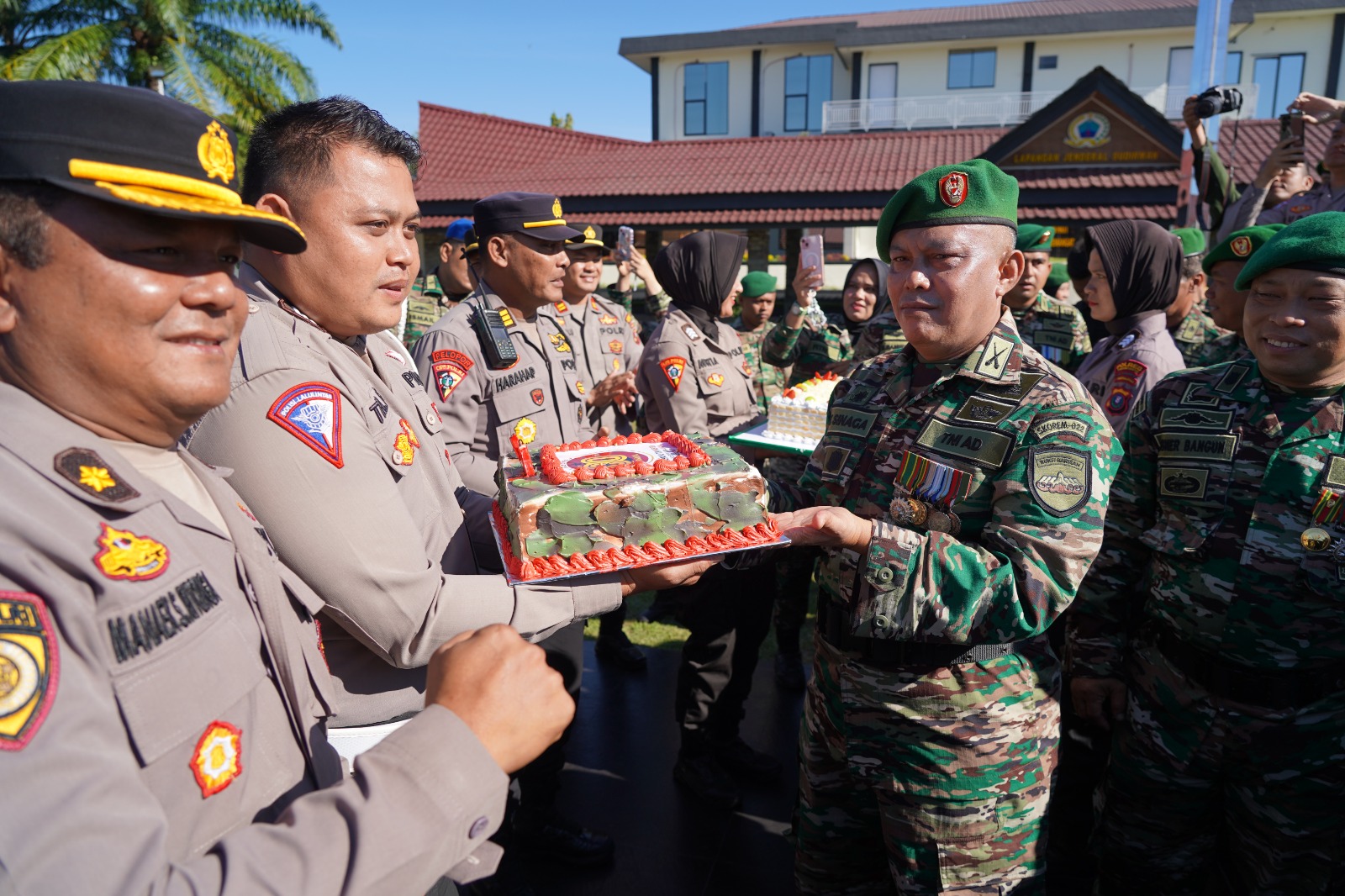 Ucapan selamat dan doa disampaikan oleh perwakilan Polres Simalungun yang disambut dengan ucapan terima kasih dari Kapenrem 022/PT. Pada acara yang berlangsung dalam suasana hangat ini, Kapenrem 022/PT menyampaikan bahwa, seperti tema HUT TNI ke-80 “TNI Prima – TNI Rakyat – Indonesia Maju”,