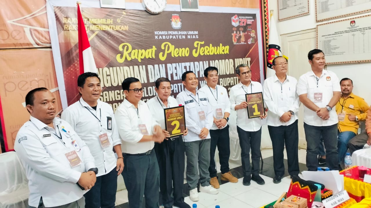 Dalam rapat pleno terbuka ini, pasangan Ya’atulo Gulo, SE, SH, MSi – Arota Lase, AMd yang diusung PDI Perjuangan, Perindo, Hanura, Golkar dan Gerindra mendapatkan nomor urut 1. Sedangkan pasangan Alinuru Laoli – Faozanolo Zai yang diusung PAN, PSI, Demokrat dan NasDem mendapat nomor urut 2.