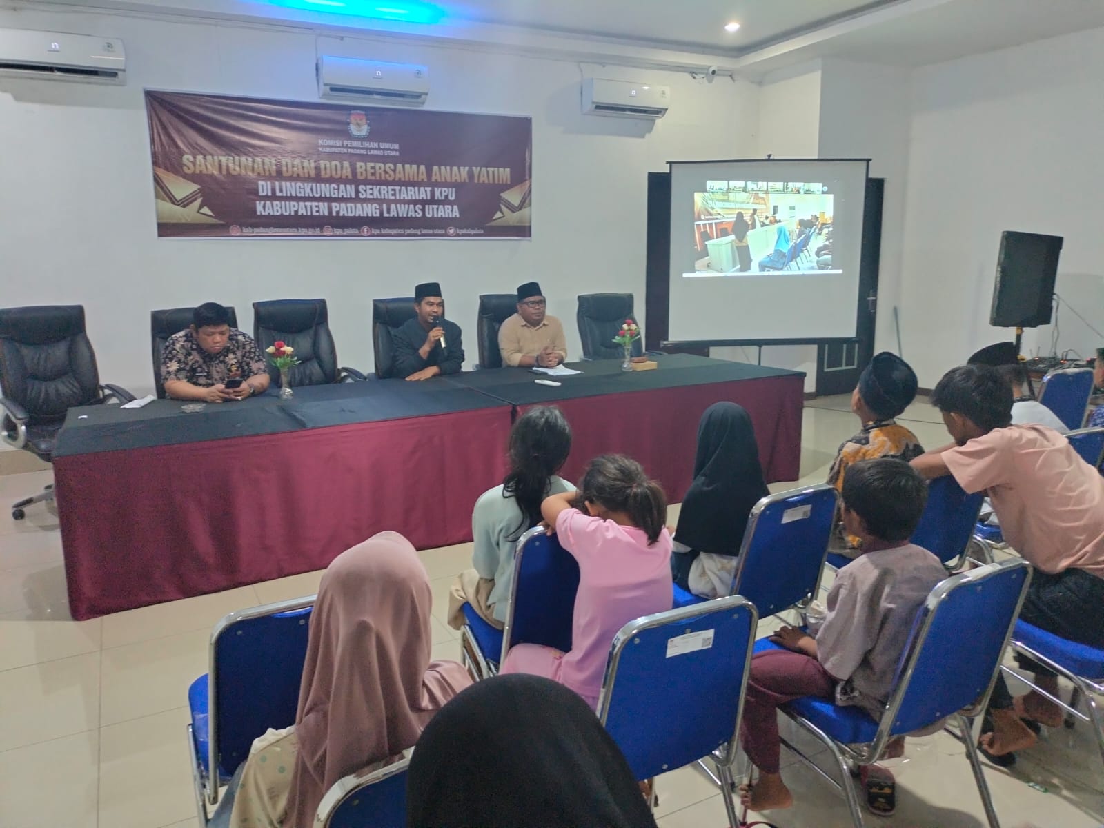 PALUTA (Berita): Komisi Pemilihan Umum (KPU) Kabupaten Padang Lawas Utara (Paluta) menyantuni puluhan anak yatim sekaligus melaksanakan doa bersama dilaksanakan di lantai II aula kantor KPU Paluta, Jalan Aminul Hajar, Lingkungan l , Kelurahan Pasar Gunung Tua. Kecamatan Padang Bolak, Jumat (13/12/2024).
