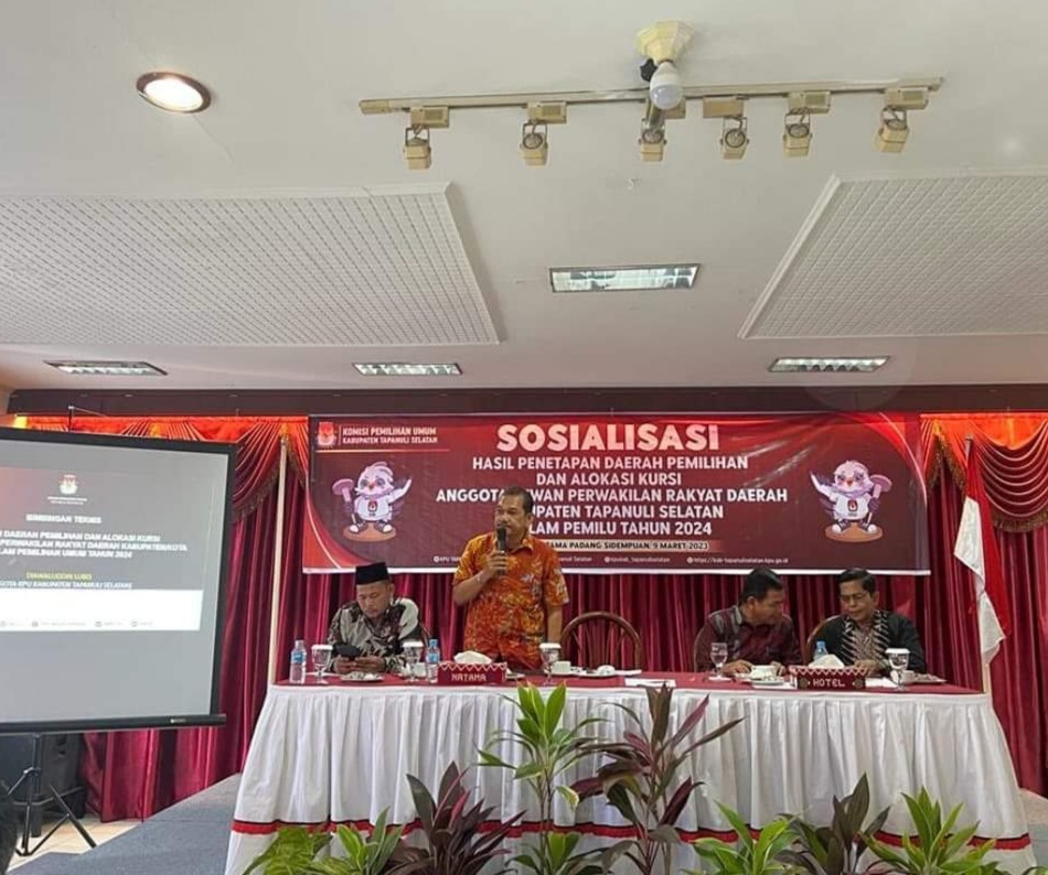 TAPSEL (Berita): Komisi Pemilihan Umum Daerah (KPU) Kabupaten Tapanuli Selatan (Tapsel) mengadakan Sosialisasi Hasil Penetapan Daerah Pemilihan (Dapil) dan Alokasi Kursi Dewan Perwakilan Rakyat Daerah (DPRD) dalam pemilu 2024.