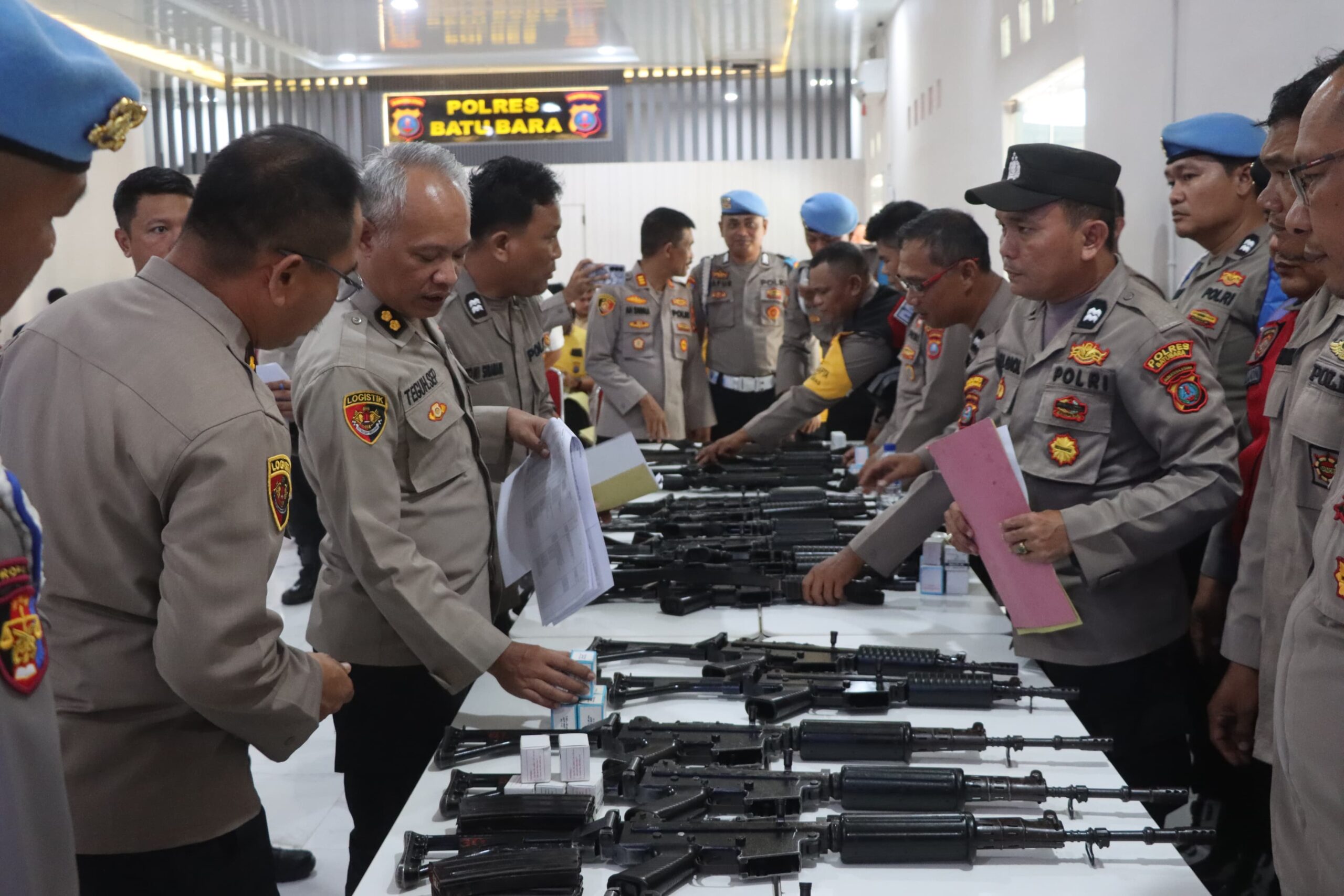 BATUBARA (beritasore.co.id): Tim Pemeriksaan dipimpin Penyelidik Pengamanan Internal Madya TK III Paminal Divpropam Mabes Polri, Kombes Pol Herry Affandi, SIK., MM didampingi perwakilan Slog Mabes Polri AKBP Teguh menyebutkan, Senjata api (Senpi) Polres Batubara aman, lengkap dan terawat.