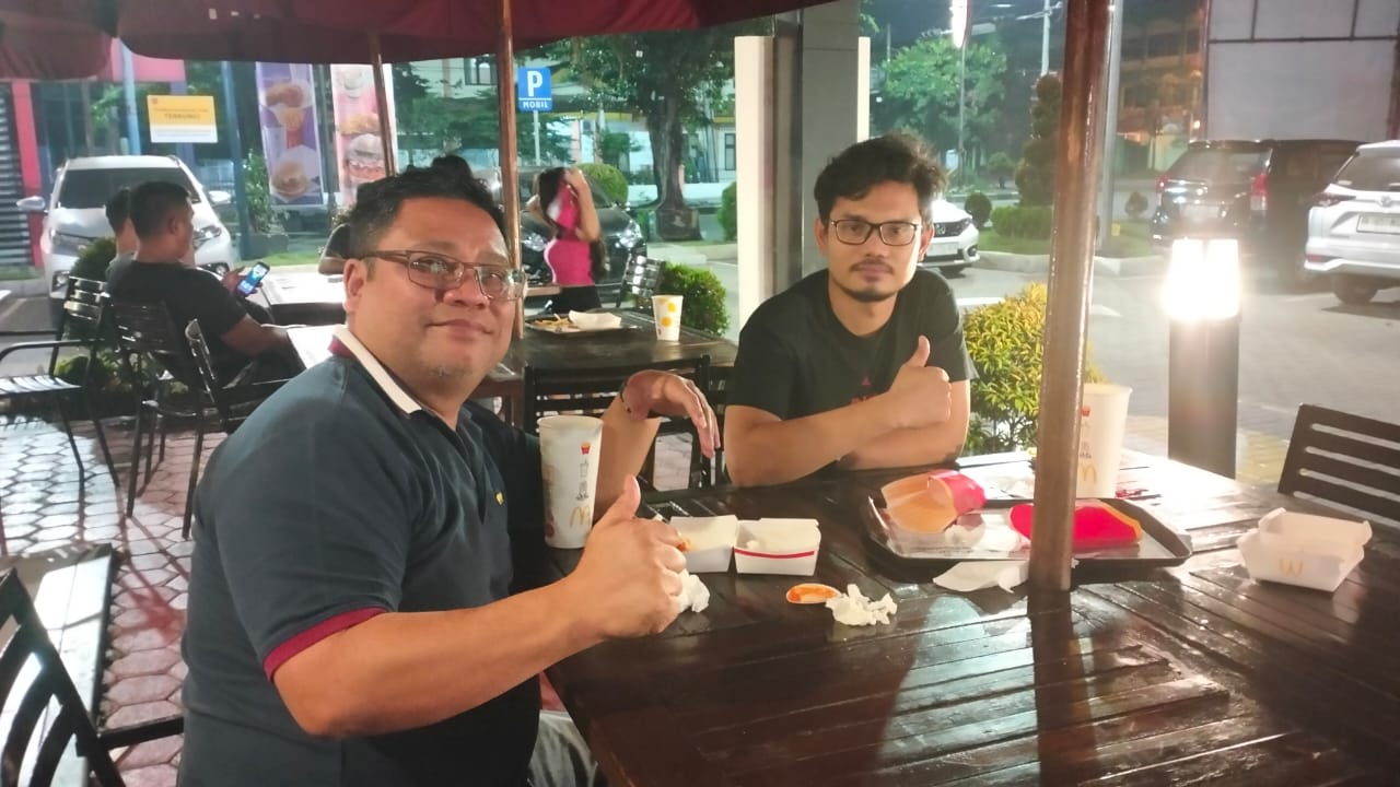Dua orang Madina nongkrong di suatu tempat di Medan, ‘tulangnya’ bersama ‘berenya’, masing-masing mengacungkan jempol.
