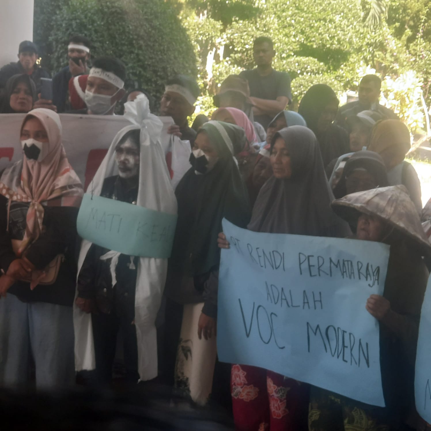 Di depan pintu masuk kantor bupati, kaum ibu bergerombol. Tuntutan mereka: menuntut hak plasma dari PT Rendi Pratama Raya.
