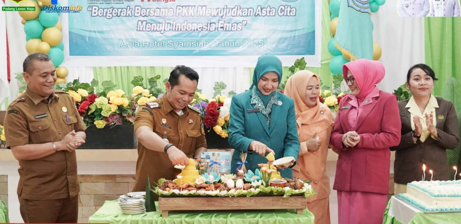 Ketua TP PKK Palas Ny Mahzalena Putra Mahkota didampingi Bupati Palas Putra Mahkota Alam Hasibuan SE memotong kue peringatan hari kesatuan gerak PKK ke-53 di Aula Hotel Syamsiah. beritasore.co.id/Ist
