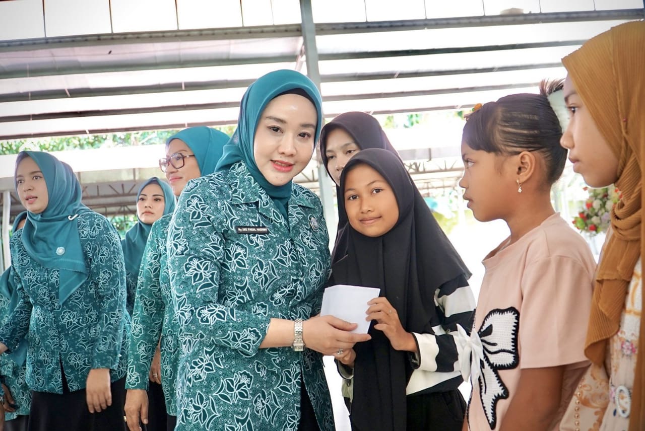 Berita Sore/ist Ketua TP PKK Langkat Ny Uke Retno Wahyuni memberikan santunan kepada anak yatim di Jambur Tanarasita, Desa Naman Jahe, Kecamatan Salapian Rabu (7/8/2024).
