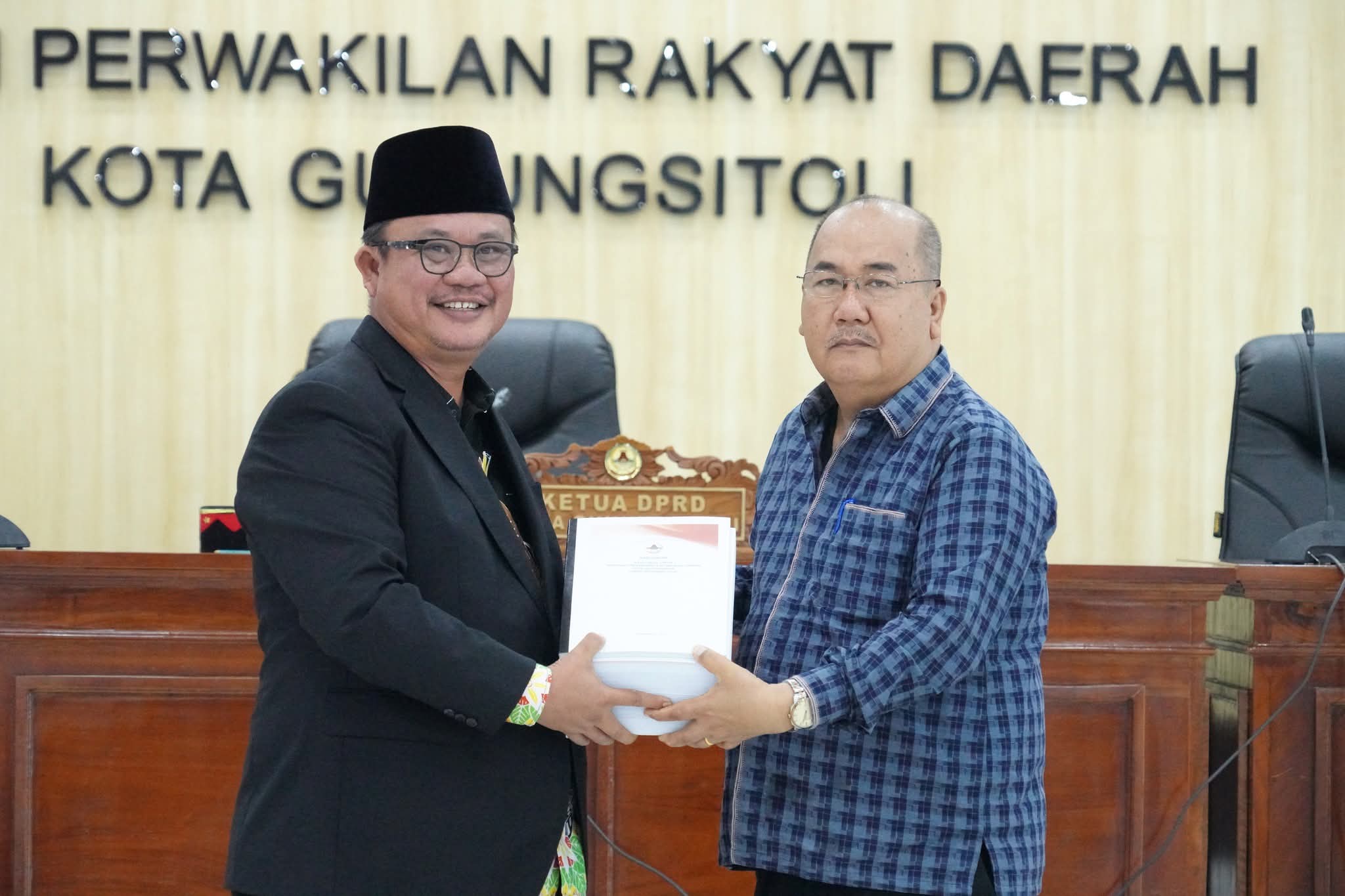 GUNUNGSITOLI (Berita): Dewan Perwakilan Rakyat Daerah (DPRD) Kota Gunungsitoli menggelar Rapat Paripurna bersama Pemerintah Kota Gunungsitoli dengan melibatkan seluruh pimpinan perangkat daerah dipimpin oleh Ketua DPRD Kota Gunungsitoli Adrianus Zega di Ruang Sidang DPRD Kota Gunungsitoli Jumat (12/9/2025).