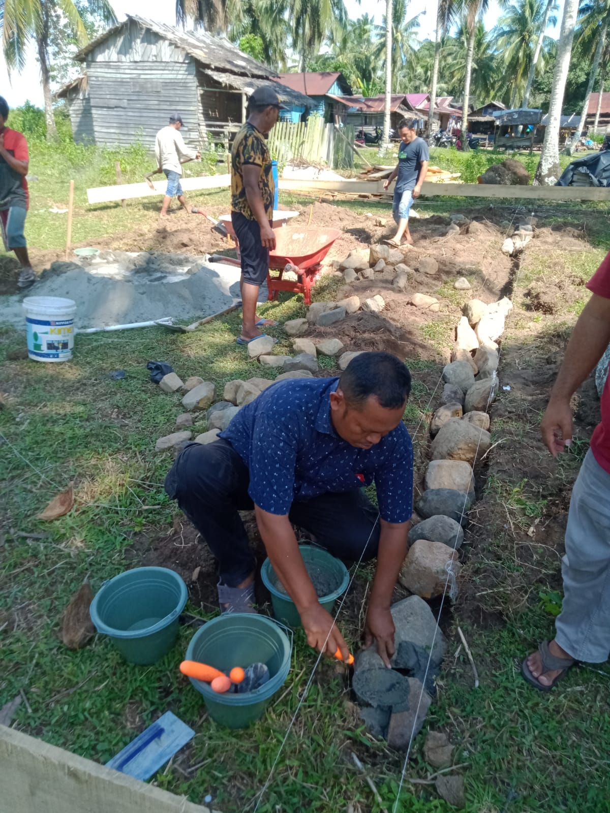 Pelatakan batu pertama pembangunan rumah layak huni di Singkuang 1 dihadiri Pj Kades Singkuang 1 Ahmad Saleh Sahputra Nasution dan Suardi dari BPD Singkuang 1. (irh)