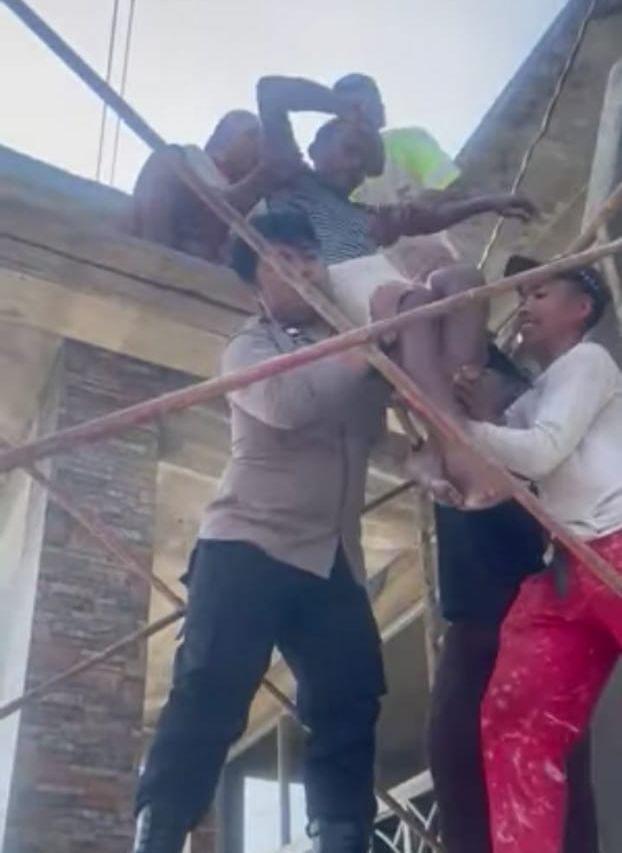 Dari lantai dua, polisi dan masyarakat mengeluarkan korban dengan susah payah untuk segera mendapatkan pertolongan.