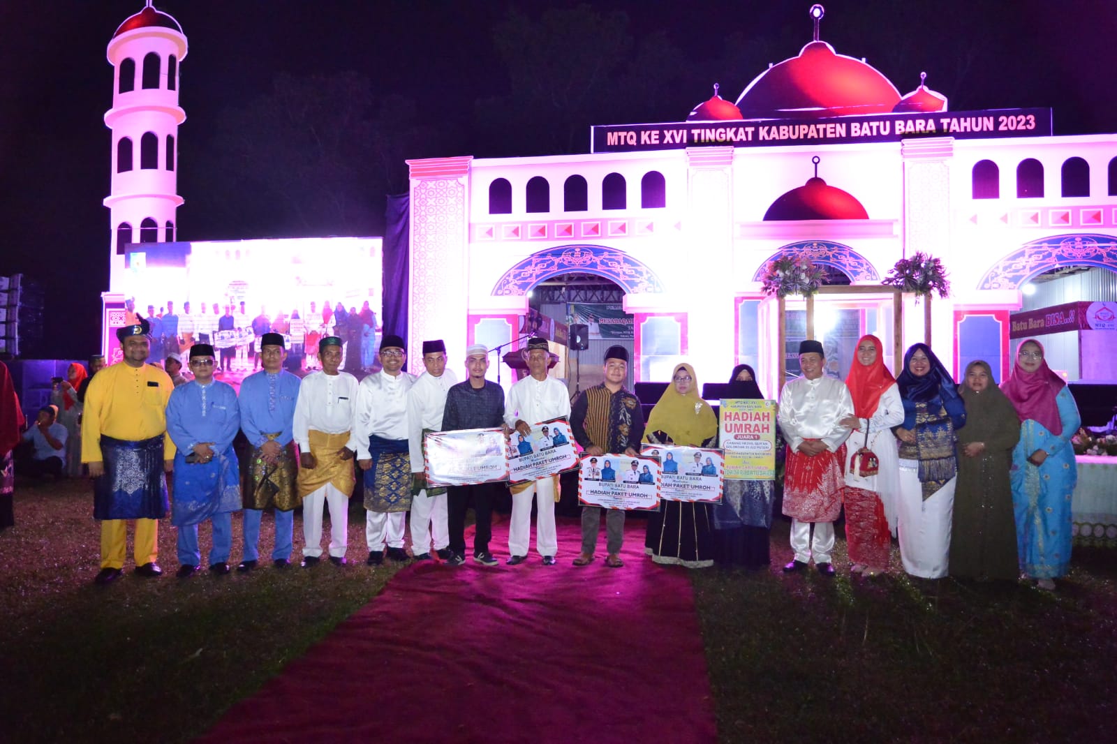 BATU BARA (Berita): Sebagai bentuk apresiasi kepada pemenang Musabaqah Tilawatil Qur’an (MTQ) tingkat Kabupaten Batu Bara, Bupati Batu Bara Ir.H.Zahir, M.AP., menyerahkah hadiah dan memberangkatkan 3 orang Umrah diacara penutupan MTQ di Lapangan Bola Kaki Dolok Pop, Desa Perkebunan Dolok, Kecamatan Lima Puluh.