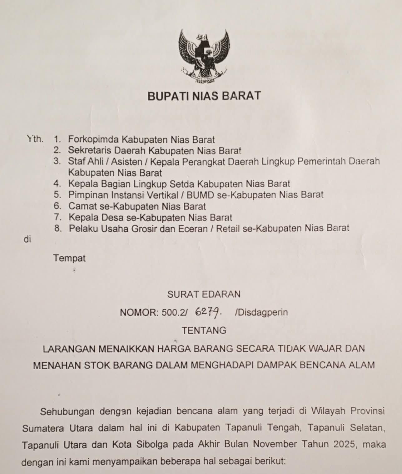 NIAS BARAT (Berita): Pemerintah Kabupaten Nias Barat resmi mengeluarkan surat edaran yang menegaskan larangan menaikkan harga kebutuhan pokok secara tidak wajar serta menahan stok barang selama masa darurat bencana alam. Edaran ini diterbitkan di Onolimbu, Rabu (3/12/2025).