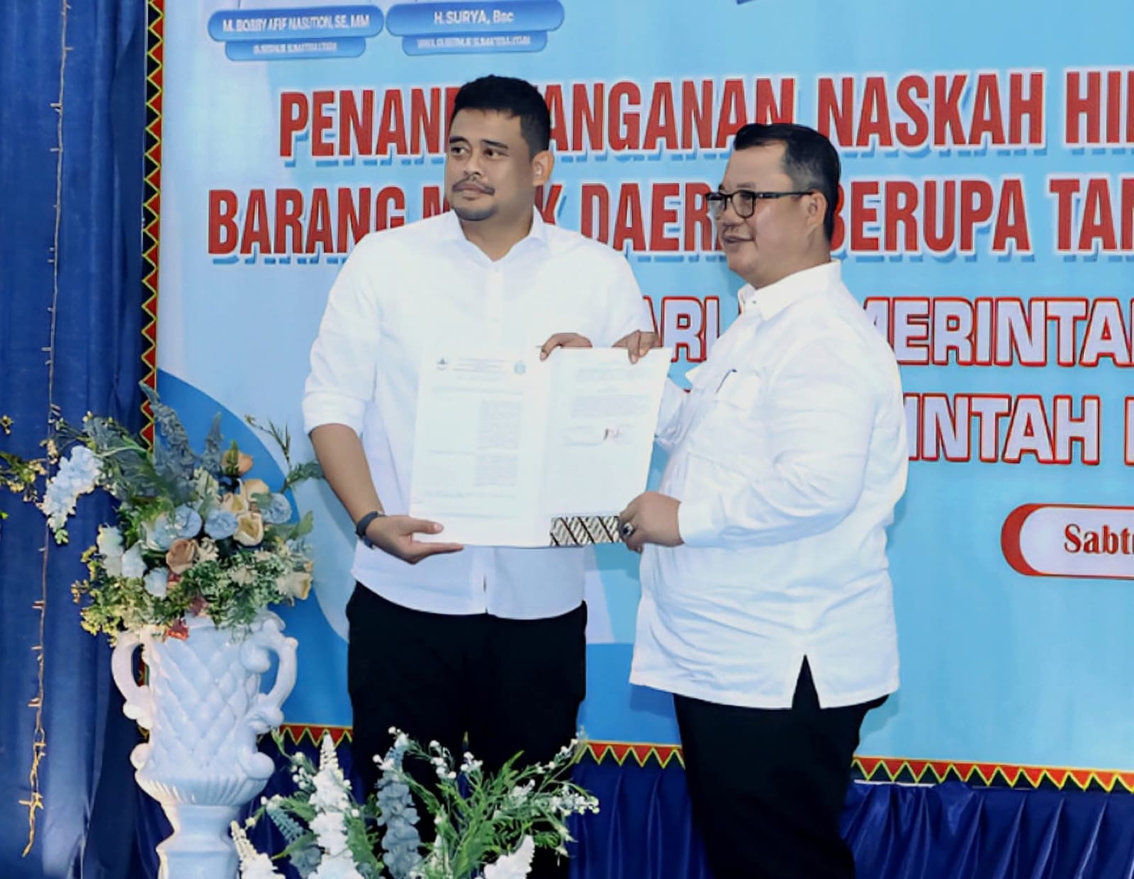 GUNUNGSITOLI (Berita): Mengakhiri kunjungan kerjanya di Kepulauan Nias, Gubernur Sumatera Utara Bobby Nasution, didampingi Ny Kahiyang Ayu, melaksanakan penandatanganan naskah hibah dan berita acara serah terima tanah SMA Negeri Unggulan Sukma Nias dari Pemerintah Kota Gunungsitoli kepada Pemerintah Provinsi Sumatera Utara.