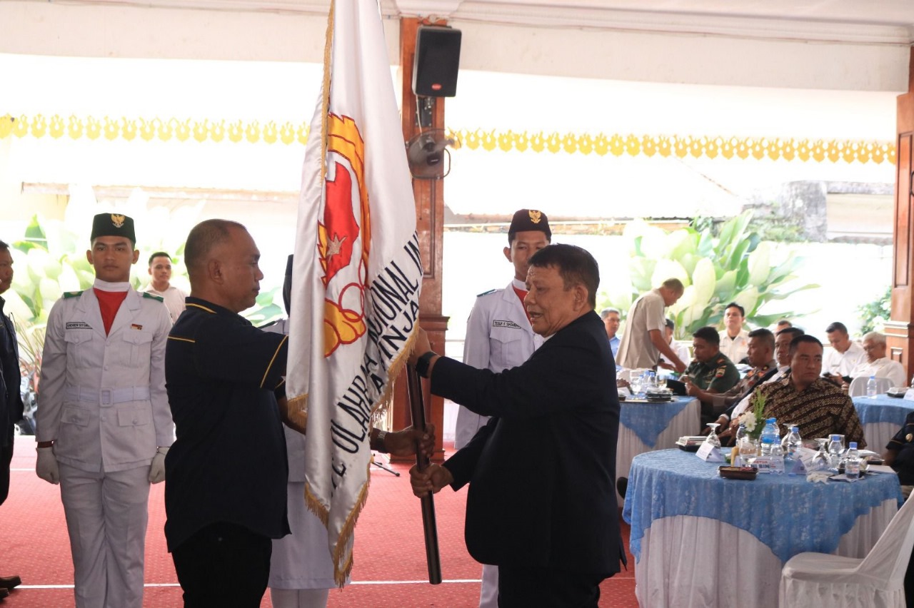 Ketua KONI Sumut Kolonel TNI (Purn.) Hatunggal Siregar menyerahkan bendera KONI Kepada Ketua KONI Binjai Arfat di Pendopo Umar Baki, Rabu (25/6/2025). Berita Sore/ist