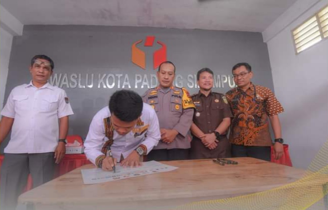PADANGSIDIMPUAN (Berita): Pj Walikota Padangsidimpuan, Dr. H. Letnan Dalimunthe, S.K.M, M.Kes diwakili Asisten Pemerintahan dan Kesejahteraan Rakyat, Iswan Nagabe Lubis, S.Sos teken nota kesepakatan tentang penertiban Alat Peraga Kampanye (APK) Pemilu di Kantor Bawaslu Kota Padangsidimpuan, Kamis (9/11).