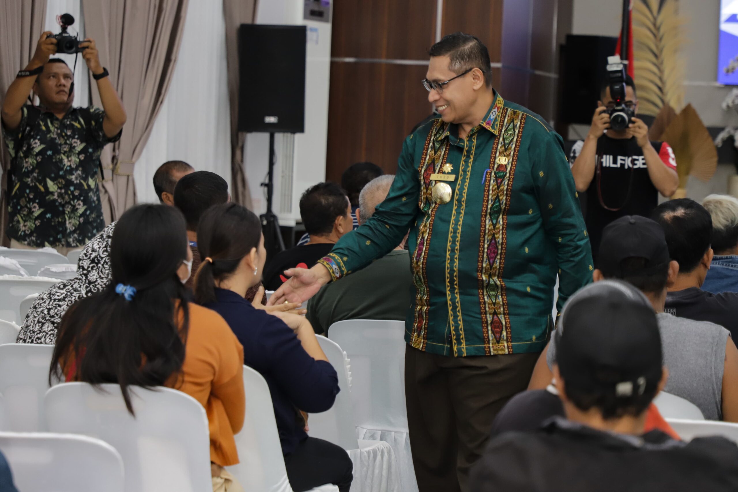 Pematangsiantar (Berita): Penjabat Sementara (Pjs) Wali Kota Pematangsiantar Drs Matheos Tan MM menghadiri silaturahmi dan sosialisasi Tanggap Darurat Tahap II kepada pedagang korban dan terdampak kebakaran gedung IV Pasar Horas, di Gedung Serbaguna Pemko Pematangsiantar, Jumat (18/10/2024) sore. Begitu tiba di lokasi pertemuan, Matheos menghampiri para pedagang di tempat duduknya.