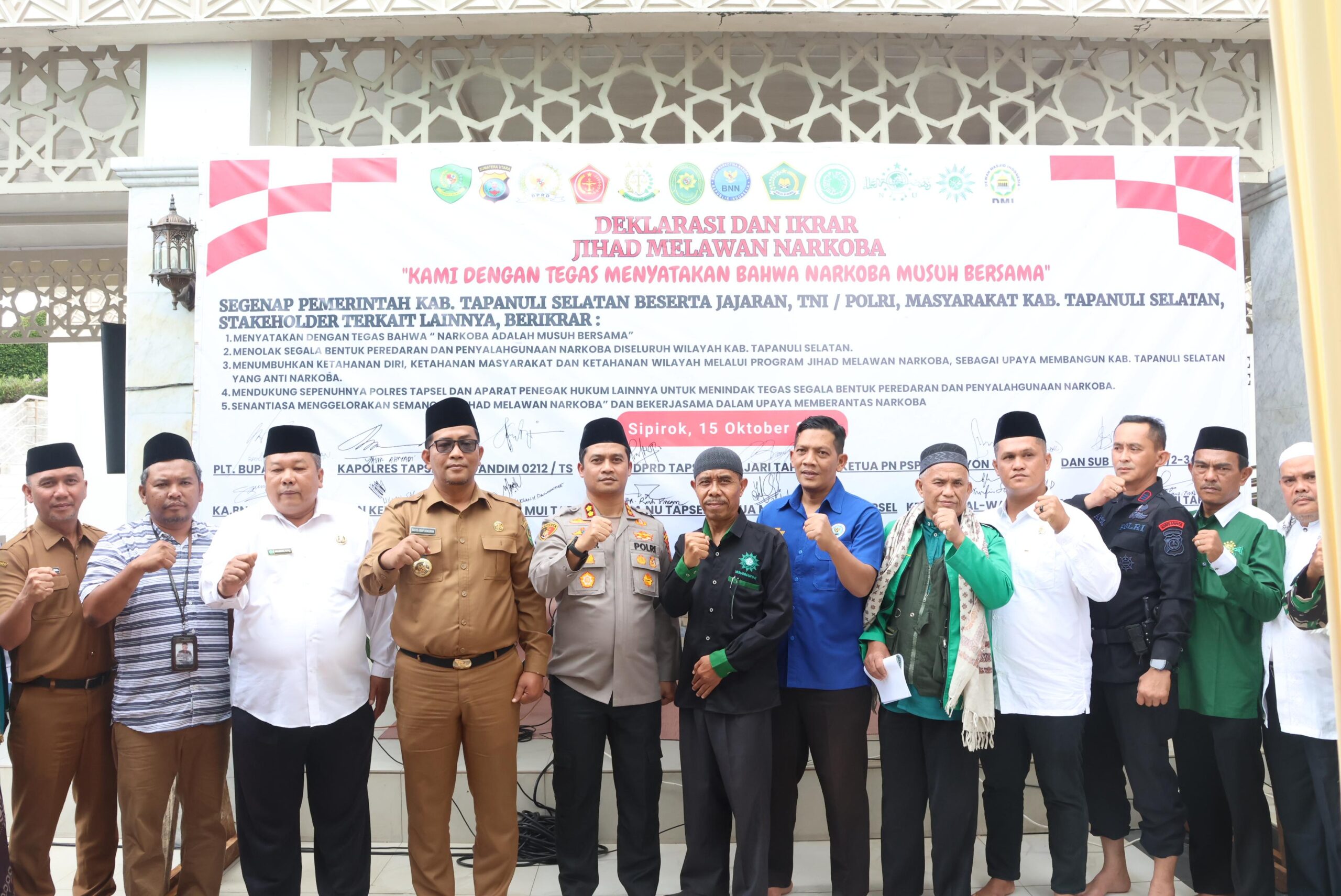 TAPSEL (Berita): Plt Bupati Tapanuli Selatan Rasyid Assaf Dongoran menyambut baik atas deklarasi dan ikrar jihad melawan narkoba yang di gagas oleh Polres Tapsel, di Masjid Agung Syahrun Nur, Kecamatan Sipirok, Selasa (15/10/2024).