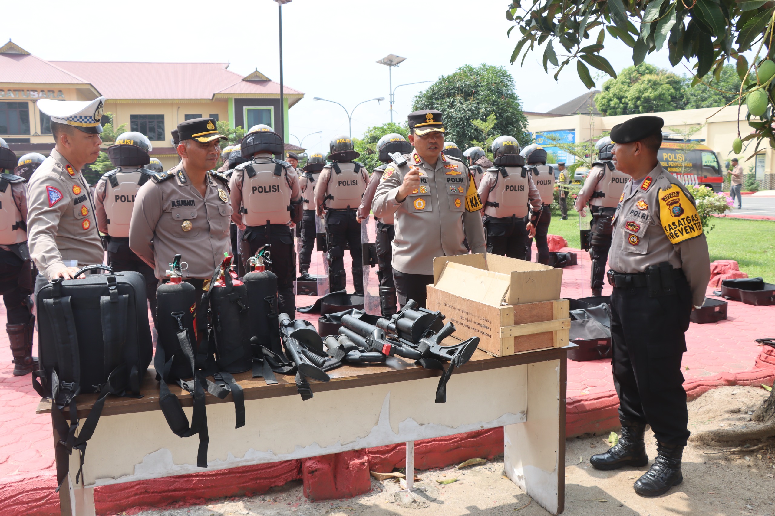 Taufiq Hidayat Thayeb S.H.S.I.K pimpin Apel dan cek kesiapan Personil Dalmas Polres Batu Bara pelaksanaan pengamanan Pemilu berlangsung 14 Februari 2024 mendatang di lapangan Moko Polres Batu Bara Jum’at (9/2-2024).