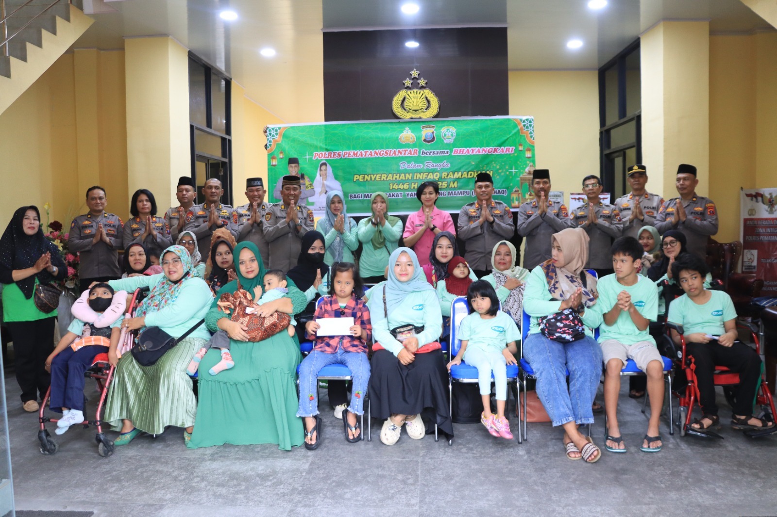 PEMATANGSIANTAR (Berita): Kapolres Pematangsiantar bersama Bhayangkari Cabang Kota Pematangsiantar melaksanakan penyerahan Infaq Ramadhan 1446 H ke Yayasan Rumah Ramah Anak Berkebutuhan Khusus (RRABK) di ruang Lobby Mako Polres Pematangsiantar, pada Rabu (19/3/2025).
