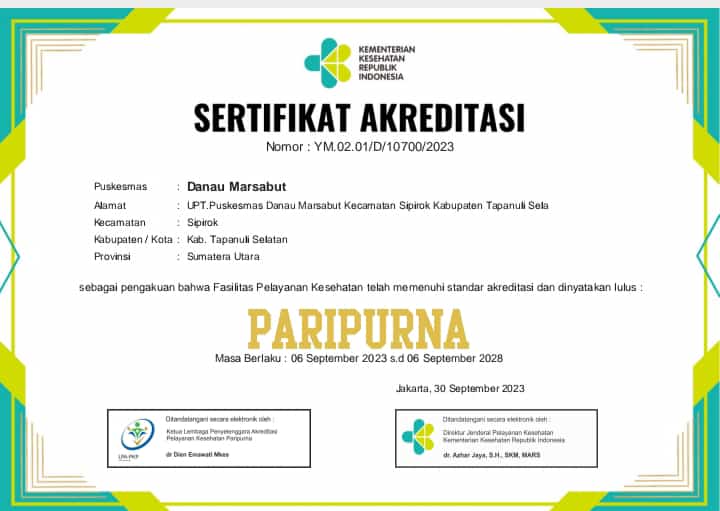 TAPSEL (Berita): UPTD Puskesmas Danau Marsabut Kec.Sipirok mendapatkan akreditasi ” PARIPURNA” dari Kementerian Kesehatan Republik Indonesia (Kemenkes RI). Akreditasi ini berlaku sejak 6 September 2023 sampai 6 September 2028.
