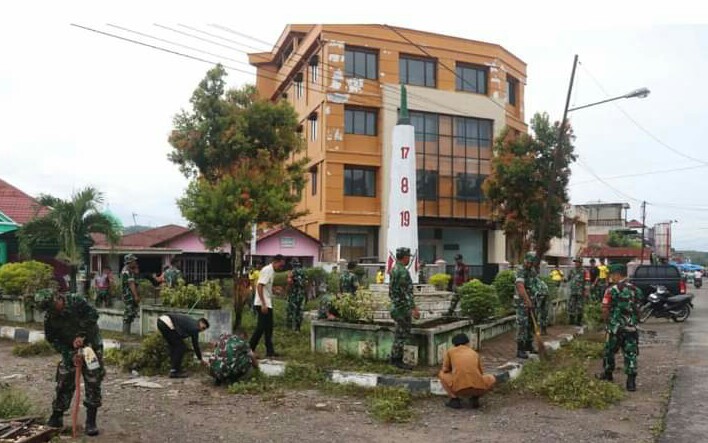 PALUTA : (Berita ) Personel TNI Angkatan Darat (AD) dari Pabung, Paluta Kodim 0212/TS, Koramil 05/PB, Kompi C 123/RW bersama Badan Kesatuan Bangsa dan Politik dan Dinas Lingkungan Hidup melakukan gotong royong membersihkan Tugu Gunung Tua, Kecamatan Padang Bolak, Kabupaten Padang Lawas Utara (21/03/2023).