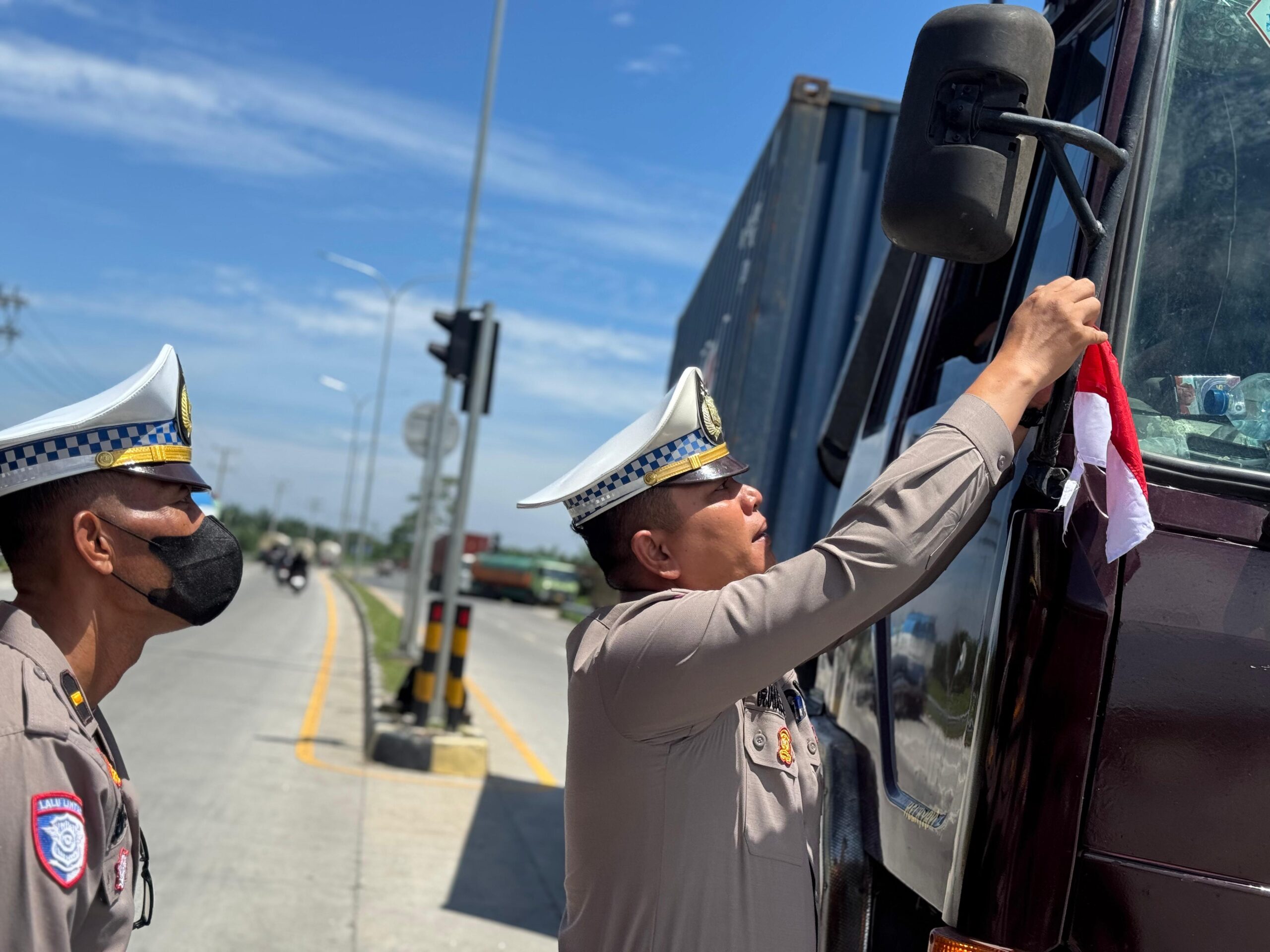 BATUBARA (Berita) Kegiatan Satlantas Polres Batu Bara membagikan Bendera Merah Putih kepada sejumlah pengendara di Jalan Raya dalam rangka menyambut Hari Ulang Tahun Kemerdekaan Republik Indonesia Ke-80 Tahun 2025 di Jalan Lintas Kabupaten Batu Bara Selasa (5/8/2025).