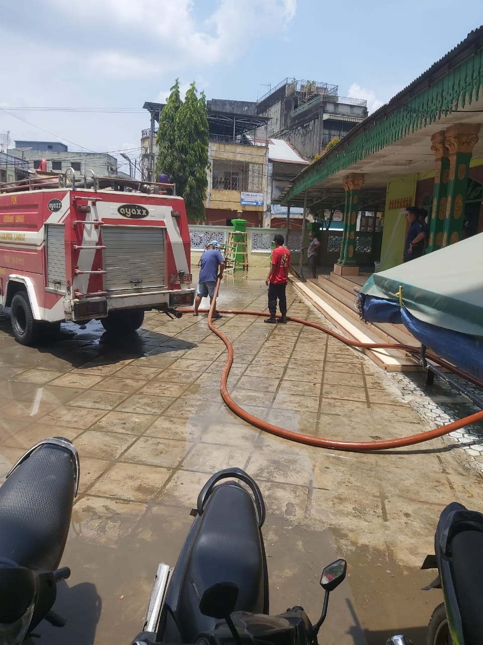 Kegiatan bersih bersih ini menggunakan mobil pemadam kebakaran guna membersihkan halaman Masjid Raya P.Brandan.