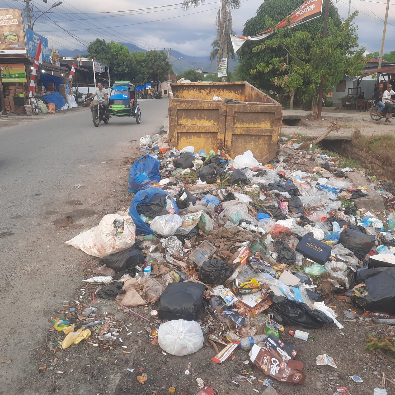 Sedangkan bak sampah di Jalan Lintas Timur, terlihat sampah dimasukkan di dalam bak sampah. Jadi, tidak terlihat sampah menggunung di luar bak. Warga dan petugas memasukkan ke dalam bak sampah.