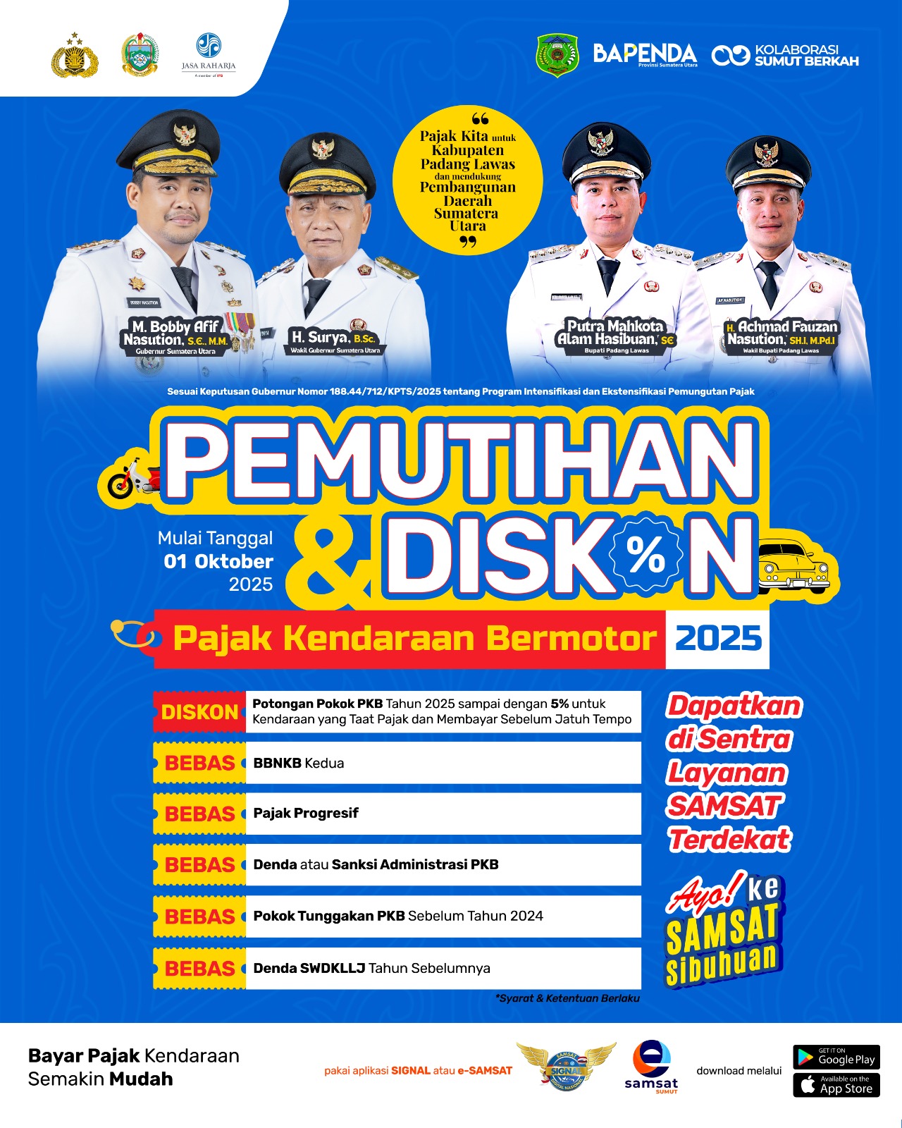 PALAS (Berita): Pemerintah Provinsi Sumatera Utara (Sumut) melalui Samsat Sibuhuan Kabupaten Padanglawas (Palas) mengeluarkan kebijakan pembebasan pajak daerah kendaraan bermotor untuk masyarakat yang dimulai tertanggal 1 Oktober 2025.