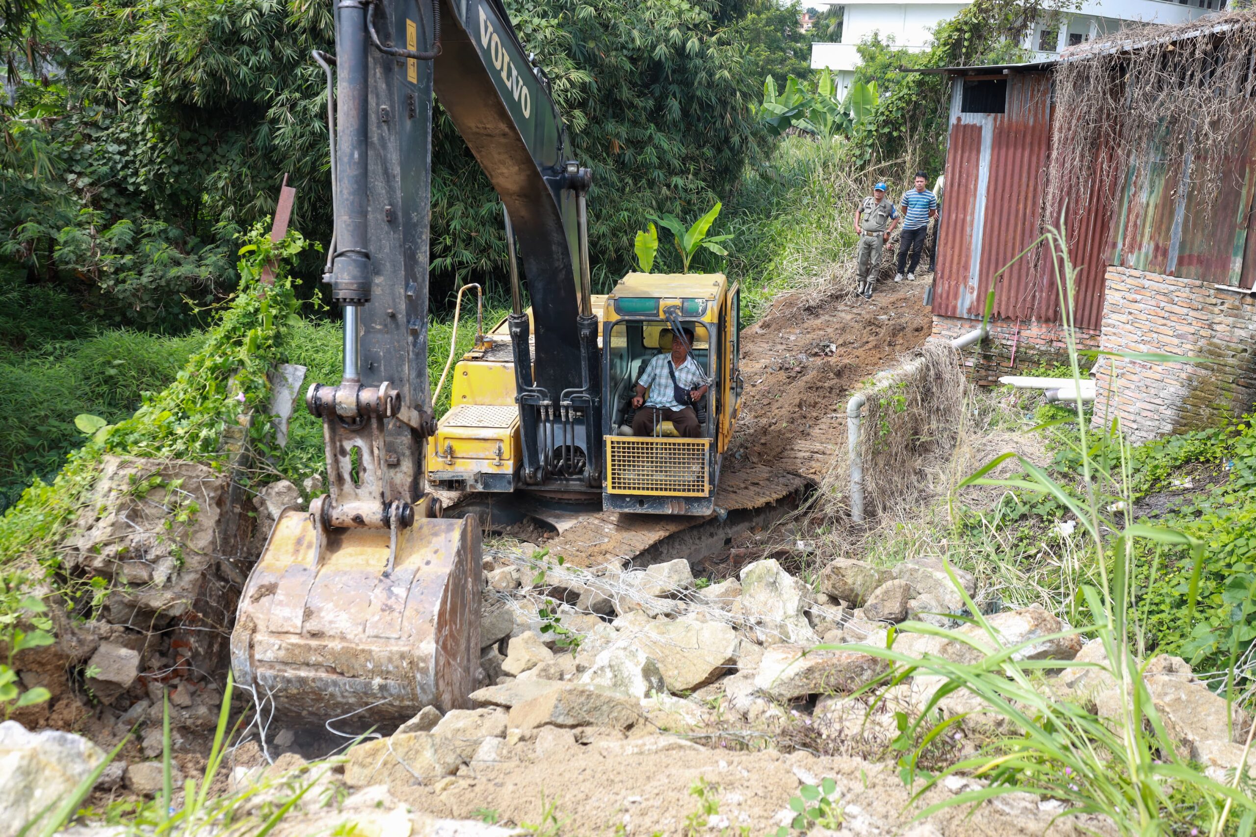 Pekerjaan masih berlangsung dengan menggunakan alat berat. Satpol PP Kota Pematangsiantar dibantu aparat kepolisian berjaga di lokasi, (srt)