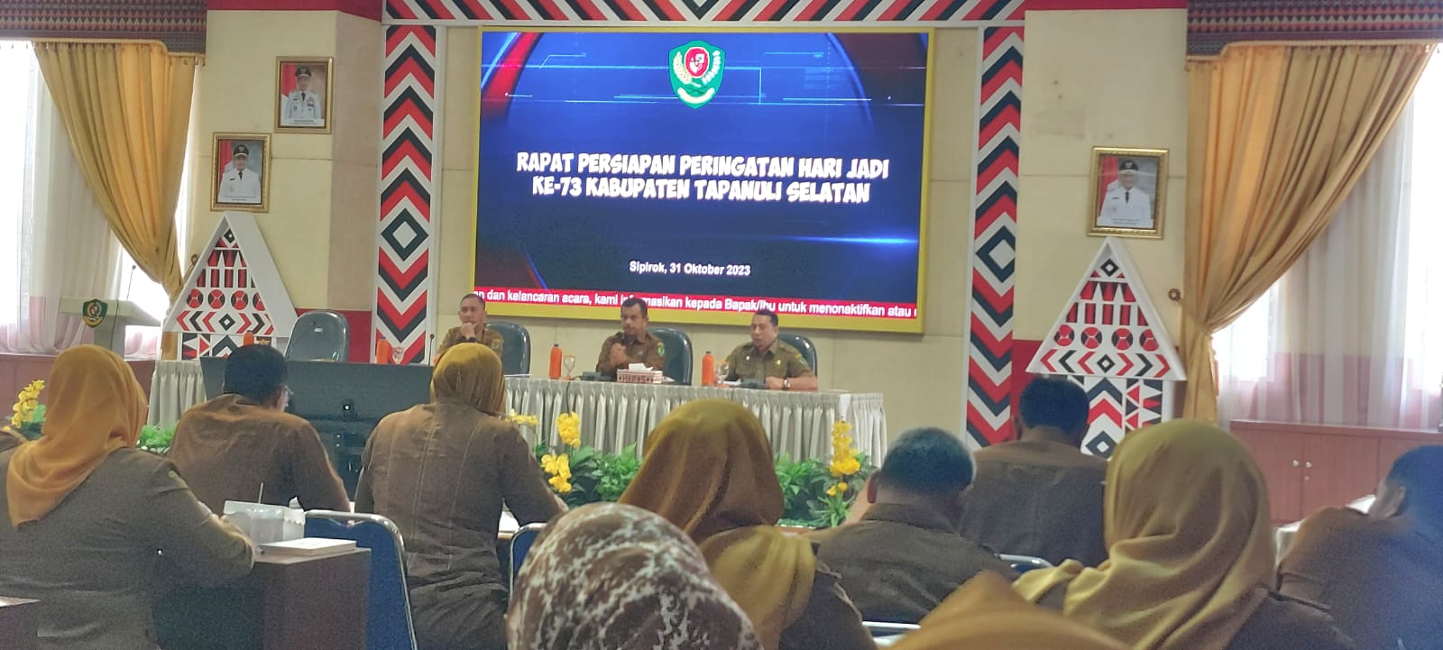 TAPSEL (Berita): Sekretaris Daerah (Sekda) Tapanuli Selatan (Tapsel), Sofyan Adil pimpin rapat persiapan Hari Jadi Ke-73 Kabupaten Tapanuli Selatan Tahun 2023 di Aula Sarasi, Lantai III, Kantor Bupati Tapsel di Sipirok, Selasa (31/10).