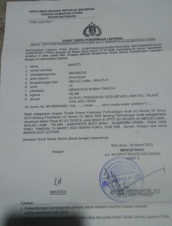 Terpisah Kepala Desa Masjid Lama dimintai keterangan terkait R, Kades mengatakan sudah mengkoordinasikan kepada orang tua korban dan pelaku, namun orang tua korban merasa tidak puas dan tidak menerima anaknya menjadi korban kekerasan oknum Guru UPTD 05 dan menolak berdamai dan melaporkan ke Polres Batu Bara No: STTLP/B/105/III/2023/SPKT/POLRES BATU BARA/POLDA SUMATERA UTARA ucap Kades.