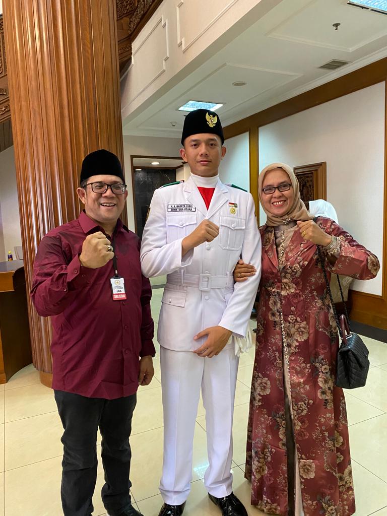 MADINA (Berita): Tetesan air mata haru dari Ketua Serikat Media Siber Indonesia Kab. Mandailing Natal, Jeffry Barata Lubis bersama istri, menyaksikan anaknya sukses kibarkan bendera Merah Putih dalam upacara peringatan HUT ke-78 Republik Indonesia di Istana Negara, Kamis (17/8).