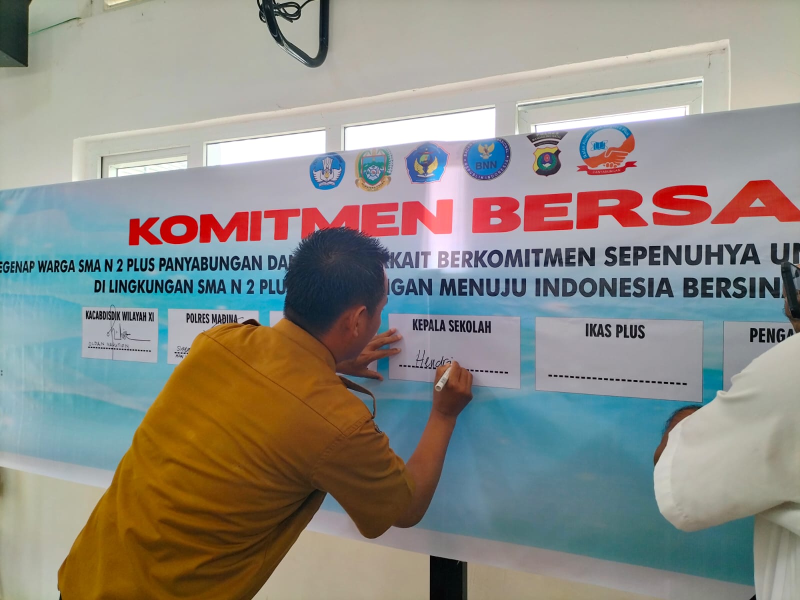 Komitmen bersih Narkoba dan judi online dengan menandatangani Kepala Cabang Dinas Pendidikan (Kacabdis) Wilayah XI Drs. Oloan Nasution bersama Kapolsek Panyabungan AKP Syarifuddin Nasution dan Perwakilan BNNK Madina, Faridah S. Kep disaksikan Kepala SMAN 2 Plus Panyabungan, Hendrik, MPd di aula SMAN 2 Plus Panyabungan, Selasa (8/10).