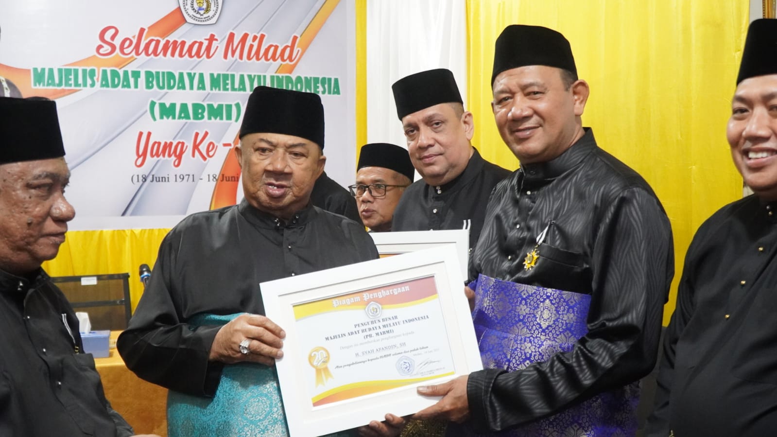 LANGKAT (Berita): Plt Bupati Langkat H.Syah Afandin SH menerima penghargaan 20 tahun pengabdian di MABMI oleh Pengurus Besar Majelis Adat Budaya Melayu Indonesia (PB MABMI) dalam rangkah milad ke-52 tahun.