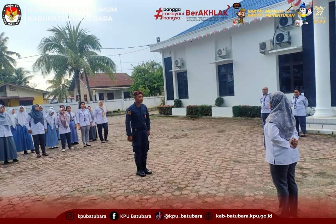Komisi Pemilihan Umum (KPU) Kabupaten Batubara gelar Apel Pagi di halaman Kantor KPU Kabupaten Batu Bara, Jalan Perintis Kemerdekaan Nomor 63 Lima Puluh.