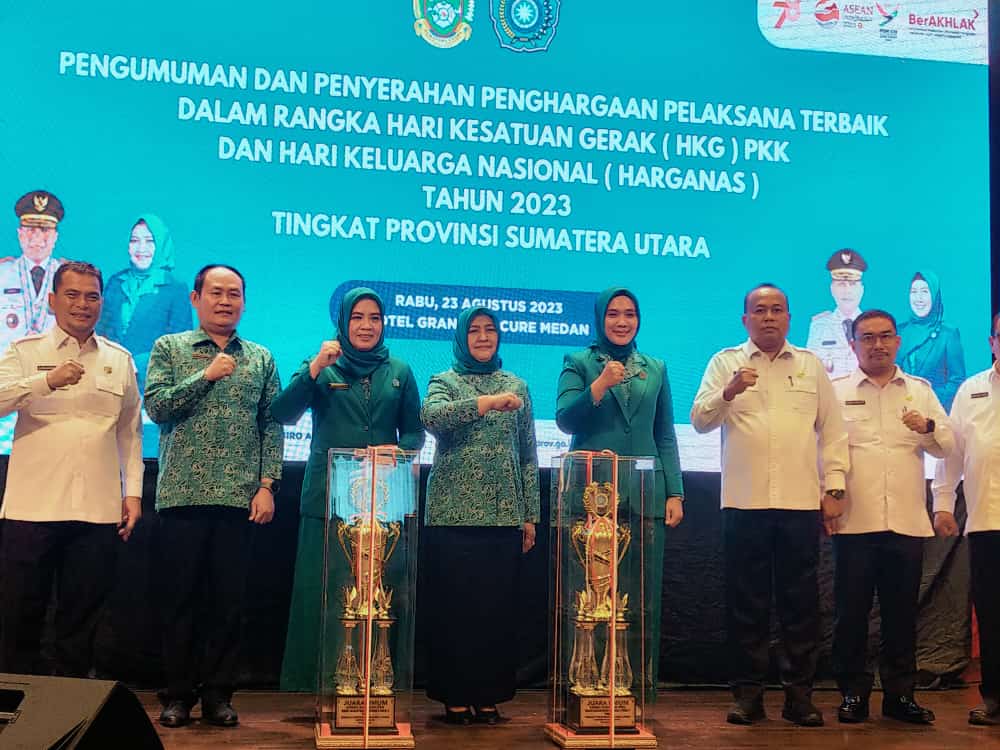 Sebagai penghargaan, Ketua TP PKK Kabupaten Tapsel Ny Rosalina Dolly Pasaribu mendapat penghargaan dari Ketua TP PKK Provinsi Sumut, Nawal Lubis di acara perlombaan Hari Kesatuan Gerak (HKG) PKK dan Hari Keluarga Nasional (Harganas) Tahun 2023 tingkat Provinsi Sumut di Hotel Grand Mercure, Jalan Sutomo No 1 Medan, Rabu (23/8).