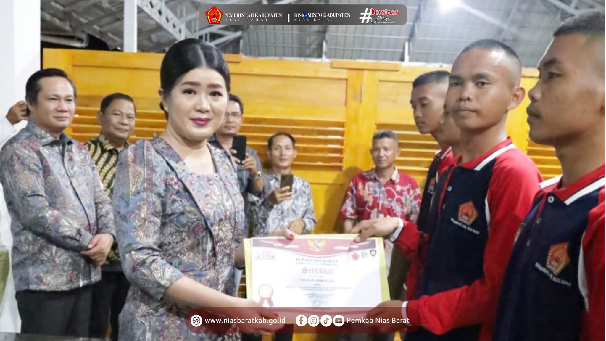 NIAS BARAT (Berita): Usai pelaksanaan Upacara Peringatan HUT ke 80 Kemerdekaan Republik Indonesia, Bupati Nias Barat Eliyunus Waruwu, SPt, MSi, bersama Wakil Bupati Sozisokhi Hia, SH, MM, melaksanakan kegiatan penyerahan sertifikat, pelepasan, dan ramah tamah bersama anggota Paskibraka Kabupaten Nias Barat Tahun 2025, bertempat di Rumah Singgah Bupati, Desa Simaeasi, pada Minggu (17/8/2025).