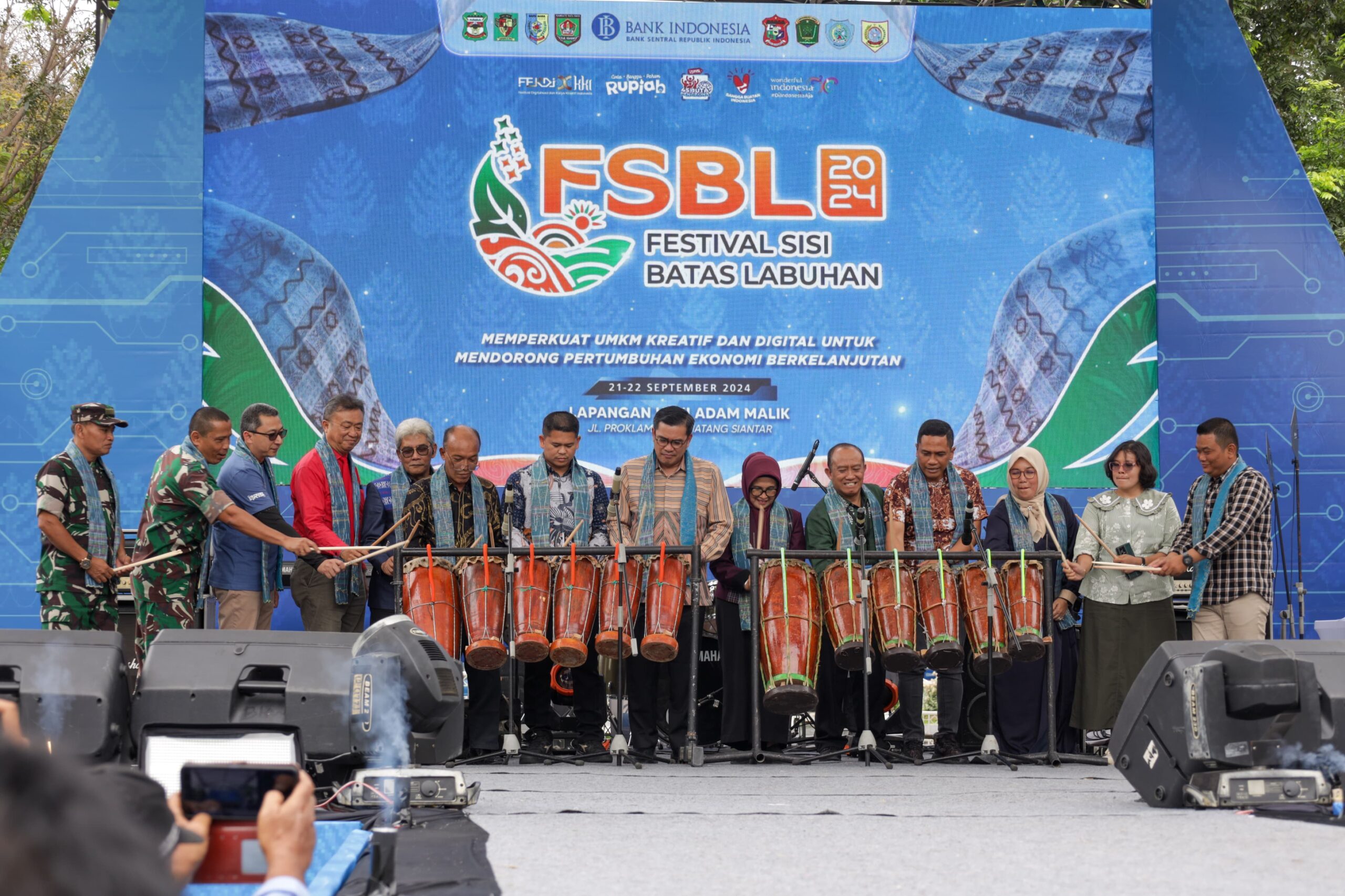 PEMATANGSIANTAR (Berita): Wali Kota Pematangsiantar dr Susanti Dewayani SpA turut membuka secara resmi Festival Sisi Batas Labuhan (FSBL) 2024 Kantor Perwakilan Bank Indonesia (KPw BI) Pematangsiantar, dr Lapangan Adam Malik, Sabtu (21/9/2024). Opening Ceremony FSBL 2024 tersebut ditandai dengan pemukulan Gordang Sipitu.