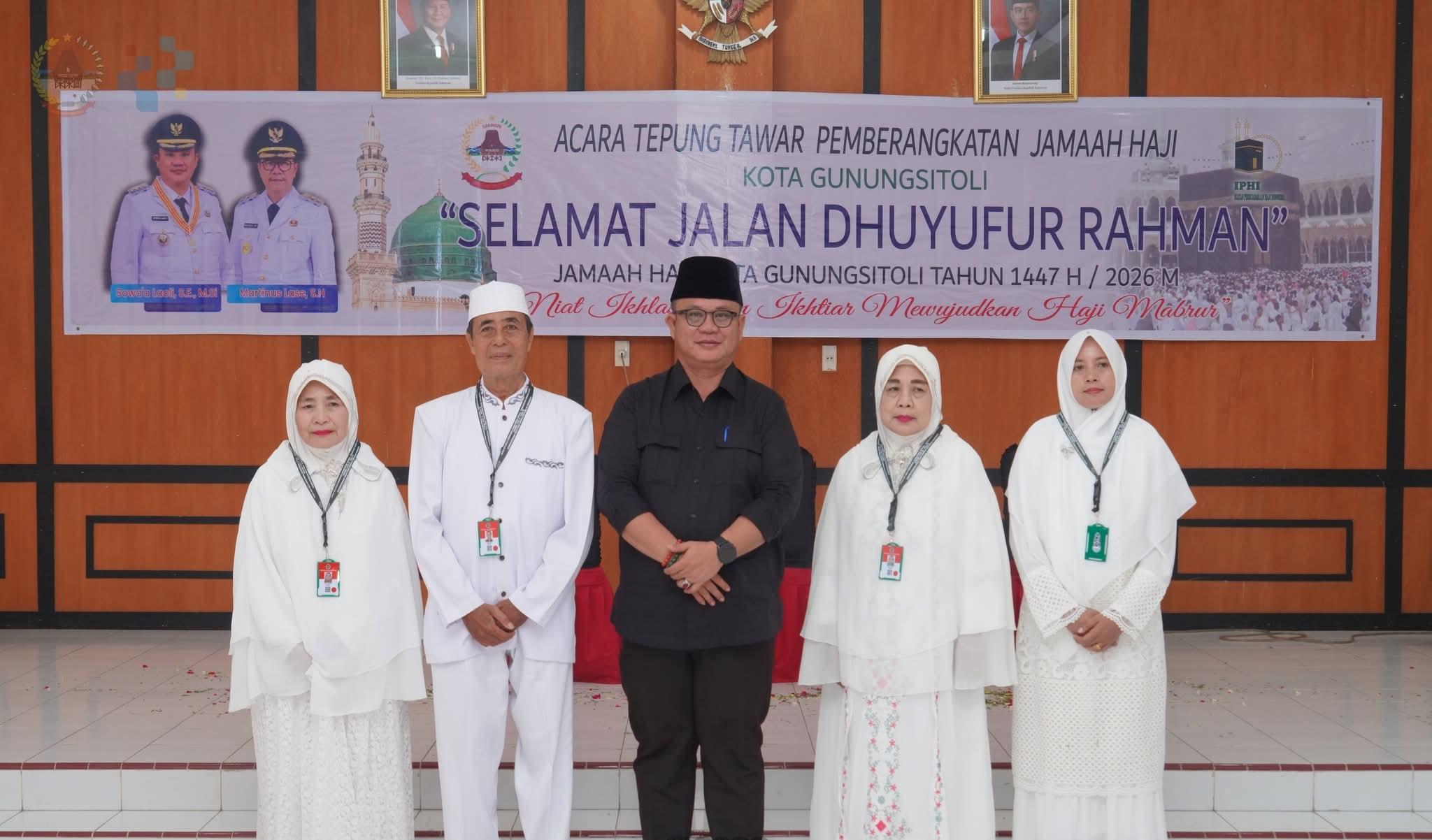 GUNUNGSITOLI (beritasore.co.id): Wali Kota Gunungsitoli, Sowa’a Laoli, SE., MSi., didampingi Sekretaris Daerah Kota Gunungsitoli, Andhika Perdana Laoly, SSTP., MSi., CGCAE., mengikuti acara tepung tawar keberangkatan calon jemaah haji Kota Gunungsitoli Tahun 1447 H/2026 M yang dilaksanakan di Ruang Rapat II Kantor Wali Kota Gunungsitoli, Jumat (17/4/2026).