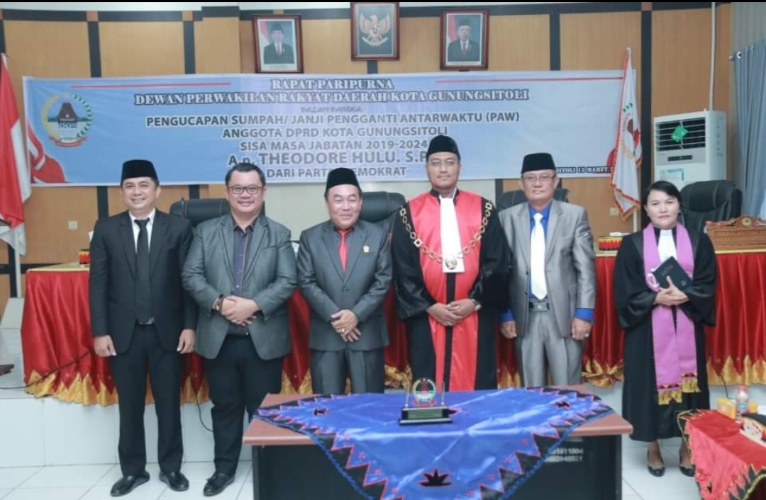 PAW sisa masa jabatan 2019-2024 itu An. Theodore Hulu, S.Pd dari Partai Demokrat, bertempat di Ruang Rapat Paripurna DPRD Kota Gunungsitoli, Jumat (15/3/2024)