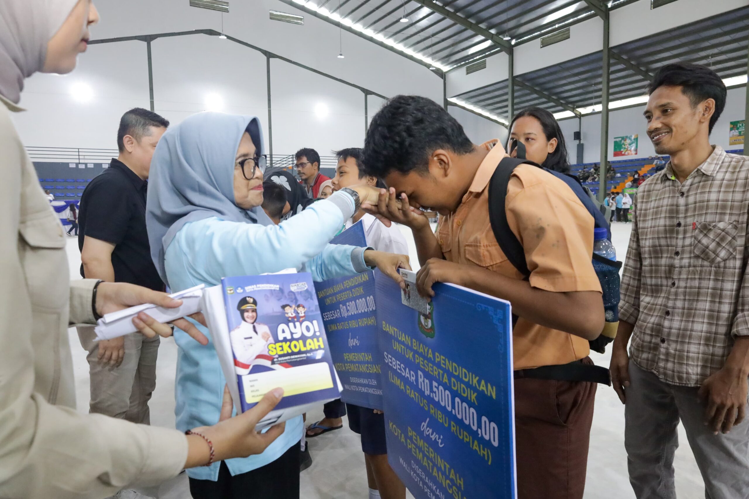 Kemudahan, penyerahan secara simbolis Bantuan Biaya Pendidikan untuk Peserta Didik masing-masing Rp500 ribu dari Pemko Pematangsiantar kepada murid SD dan SMP oleh dr Susanti dan Kepala Dinas Pendidikan Muhammad Hamdani Lubis SH.