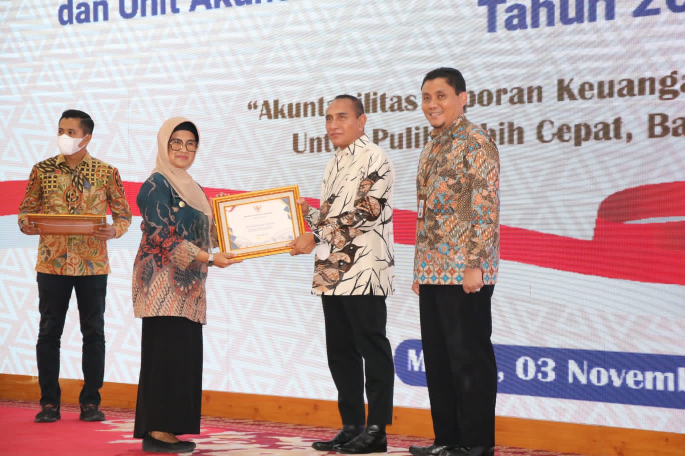 Penghargaan tersebut diserahkan oleh Gubernur Sumatera Utara Edy Rahmayadi didampingi Kepala Kantor Wilayah Direktorat Jenderal Perbendaharaan Kementerian Keuangan Republik Indonesia Provinsi Sumatera Utara Heru Pudyo Nugroho pada Rapat Koordinasi Pemerintah Daerah dan Unit Akuntansi Pembantu Penggunaan Anggaran Wilayah (UAPPA-W) Tahun 2022, di Aula Tengku Rizal Nurdin Rumah Dinas Gubernur Sumatera Utara, Jalan Jenderal Sudirman No 41 Kota Medan, Kamis (3/11/2022).