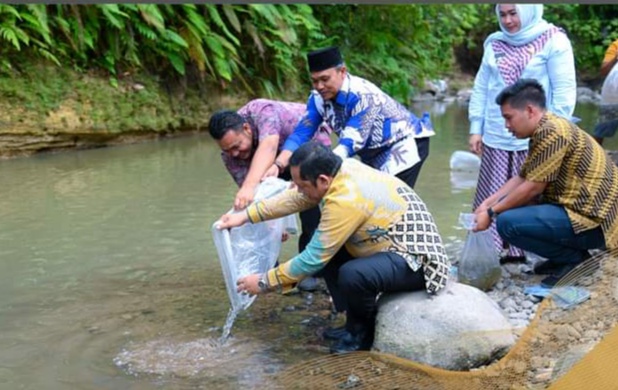 P.SIDEMPUAN (Berita): Walikota Padang Sidempuan, Irsan Efendi Nasution, SH, MM dengan Anggota DPRD Padang Sidempuan, Erpi J Samudra dan Dinas Pertanian melaksanakan tebar benih ikan di lubuk larangan Panyanggar, Kec. Padang Sidempuan Utara, Kamis (2/2).