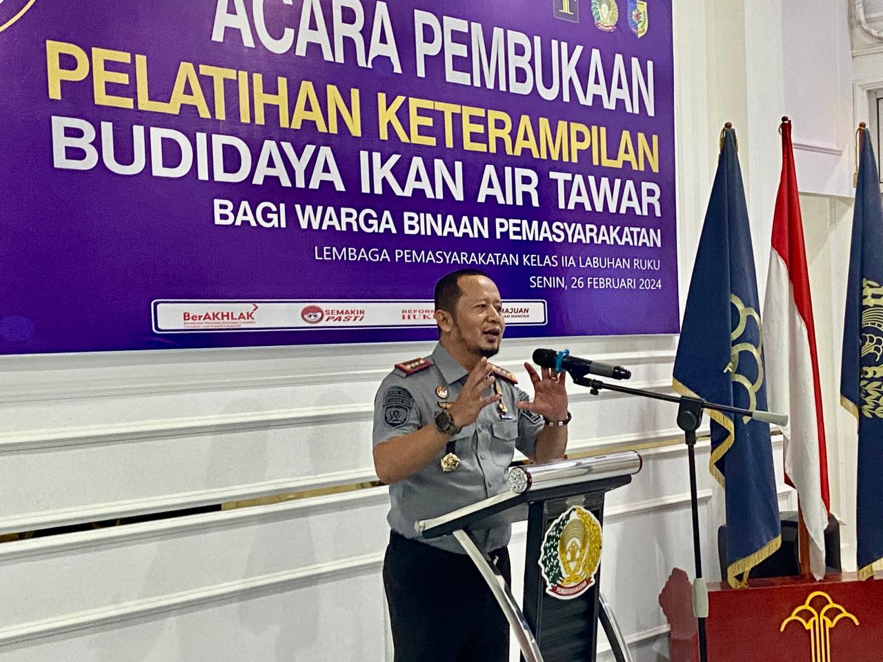 Teks fhoto: tingkatkan keterampilan, Lapas Labuhan Ruku membuka pelatihan Budidaya ikan air tawar kepada 20 WBP di Aula Lapas Kelas II Labuhan Ruku Senin (26/02/2024).