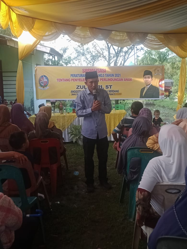 DELISERDANG (Berita): Anggota DPRD Deli Serdang dari partai Golkar Zul Amri ST,mengelar sosialisasi peraturan Daerah (Perda) No:5 Tahun 2021 tentang penyelengaraan perlindungan anak.